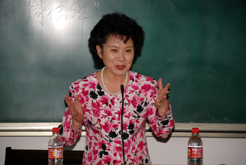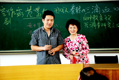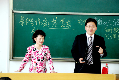 在与现场同学进行互动时,同学们不时地向陈女士询问播音与主持艺术、汉语发音等方面的问题,来自文法学院播音主持专业的张静同学,现场朗诵了《微笑》之后,陈女士从专业角度做了点评,通过现场演示、作了生动的讲解,场面异常活跃。作为戏曲栏目《秦之声》资深主持人,陈女士就秦腔的起源、发展、继承等方面的问题与现场师生进行了互动交流,并现场给大家演唱了秦腔,博得在场师生的阵阵掌声。陈女士说,作为一个主持人,不仅仅是要获得观众的喜爱,更重要的是自觉承担起继承和传播中国传统文化的责任。钟情于秦腔文化研究的文法学院车宝仁副院长用高昂的声调,也现场演唱了一段秦腔。报告会场面异常活跃,笑声、歌声、掌声不断响起。