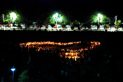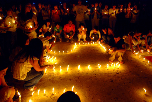 16日晚8:00,在学校的大力支持下,在西安培华学院红十字会和在校四川籍同学会的共同组织下,同学们手持蜡烛,来到操场。姜院长亲自在操场指挥同学们列队,闻知蜡烛不够时,学校小吃街超市的老板免费提供了近百支……原本喧闹的操场一下子变得那么安静,所有的同学都屏住了呼吸,紧紧握着手中的蜡烛,祈愿生命之神眷顾还在废墟中等待营救的生命,祈愿他们穿越漫长的煎熬,重新回到生活的怀抱,祈愿信念之光照耀着劫后余生的同胞们,尽快走过悲伤和黑暗,重建美丽的家园