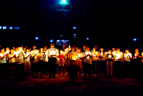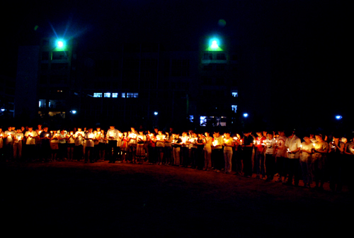 夜深了,点点烛光、颗颗爱心汇集成暖暖的祝福飞向四川灾区,飞向汶川。刚下晚自习的同学也自发地参与其中,大家一起默默祈祷,默哀……培华上空萦绕着淡淡的歌声久久不散:“这是心的呼唤,这是爱的奉献……”,歌声、烛光、眼泪融为一幅感人的画面。