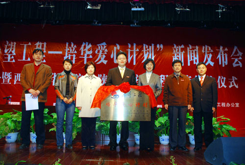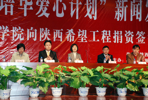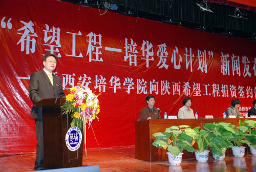 4月21日上午,我校和共青团陕西省委、陕西省实施希望工程办公室共同启动了2008 “希望工程-培华爱心计划”暨西安培华学院向陕西希望工程捐资签约仪式。大会由我校党委书记王斗虎主持。我校理事长、院长姜波与陕西省希望办主任陈如意签署捐赠协议书;共青团陕西省委副书记张小平和姜院长共同为“希望工程-培华爱心计划”揭牌;共青团陕西省委书记卫华出席仪式并致辞,人民日报、光明日报、中国青年报、陕西电视台、西安日报、华商报等二十余家媒体参加了发布会。