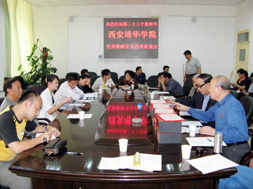 在第二十三个教师节来临之际,西安培华学院党委于9月9日,在长安校区召开庆祝教师节暨优秀教师党员表彰、座谈会。会议由党委书记周振豪同志主持。出席会议的有:党委委员、各院(系)党总支部(党支部)书记、人事处、教务处领导和受表彰的席德生等8名优秀教师党员。会上党委委员、副院长邵兴运同志宣读了党委“2007年度教师节表彰优秀教师党员的决定”,周书记为席德生、赵洁、钱海敏、孟君、梁蕊、闫长浩、李清、张战涛等8名优秀教师党员颁奖;党委委员、副院长杨定君作了主题发言;8名优秀教师党员相继发言。最后,由党委周书记作了指示。