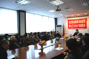 艺术设计学院赵副院长向戴院长介绍了院里师资力量、软硬件设施的一些情况,并表示要积极配合戴院长的工作,共同将艺术学院的工作推上新台阶。 周书记、杨院长、邵院长都对戴院长的到来表示了热烈的欢迎。艺术设计学院苏老师也代表艺术系的全体老师慷慨激昂的发言:要在搞好教学的同时积极配合学院工作! 会后,戴院长和学院教师们亲切交谈,了解艺术设计学院的情况。
