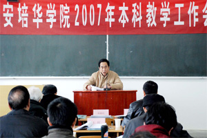 为提高本科教育质量,实现本科评估创优,研讨本科教学工作,讨论通过制(修)订07级(06级)本科教学计划的实施意见。我院于元月下旬在高新校区召开了“西安培华学院2007年本科教学工作会议”。学院党委周振豪书记、副院长姜波、王天木、陈胜秋、王超、邵兴运、杨定君、姜朗副董事长、陆忠明总会计师及各院系处(室)领导参加了会议。周振豪书记首先致辞。他在致辞中期望我院步入本科教育先进行列;