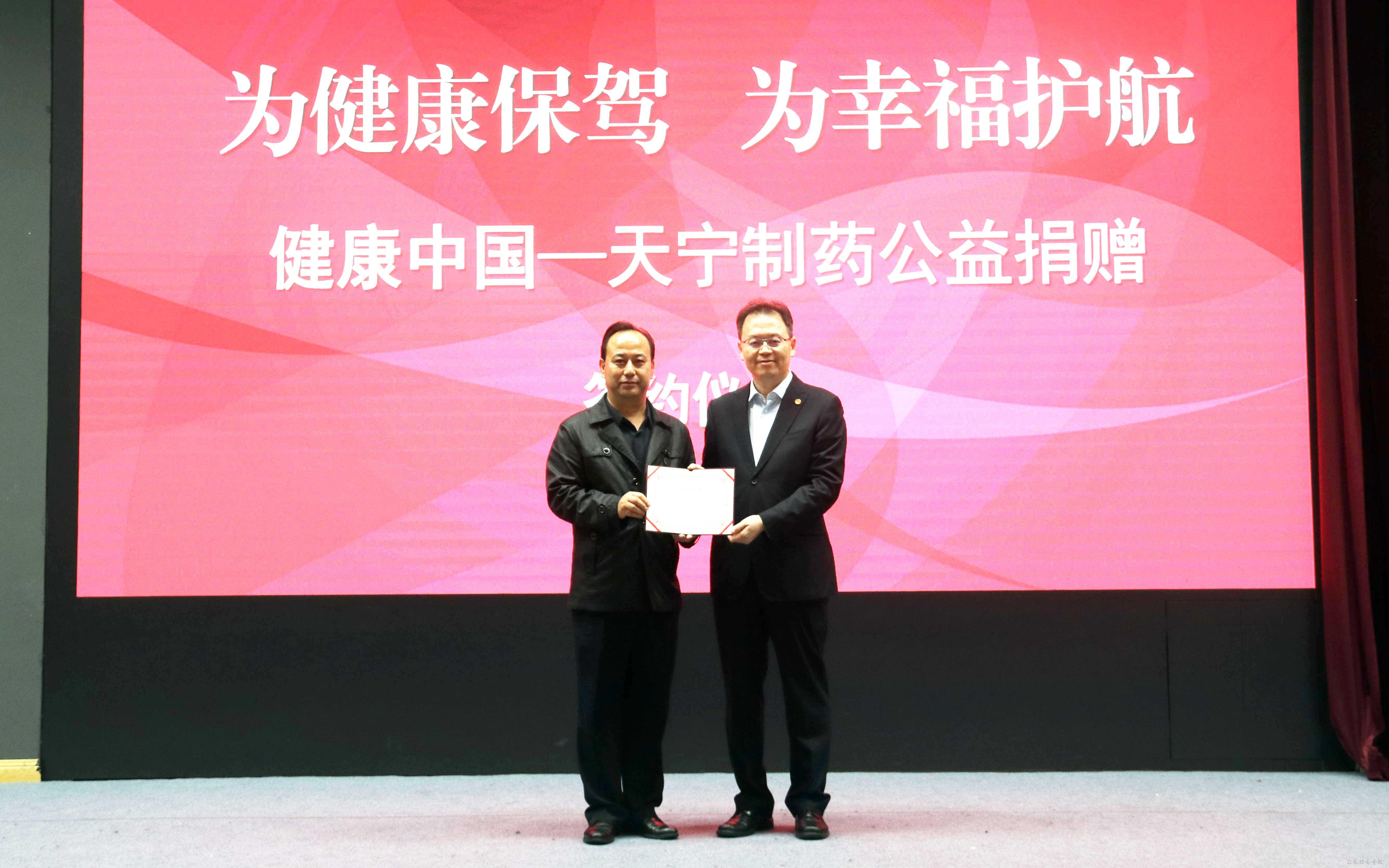 天宁制药有限责任公司营销中心总监拓兴伟与西安培华学院医院院长李旭军签署了公益捐赠协议