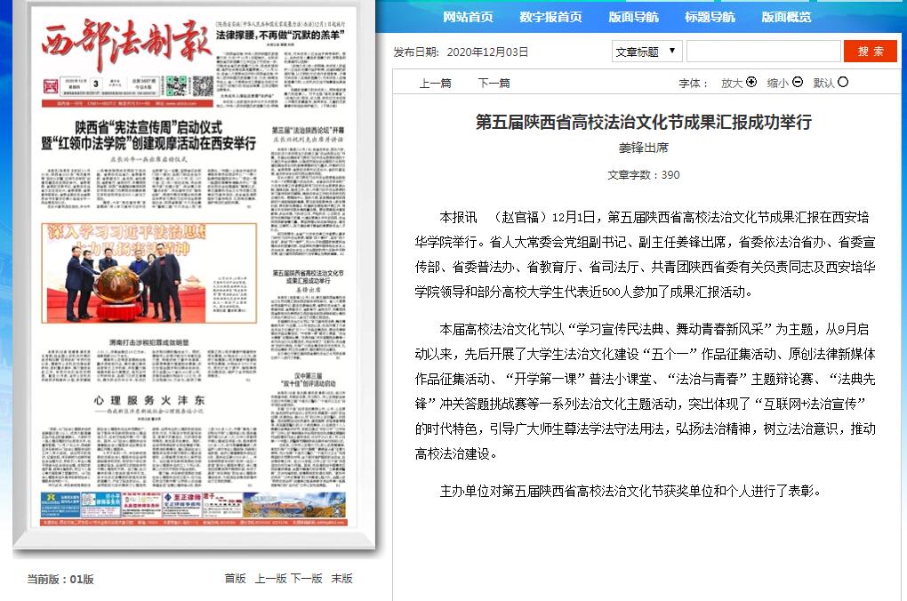 本报讯 (赵官福)12月1日,第五届陕西省高校法治文化节成果汇报在西安培华学院举行。省人大常委会党组副书记、副主任姜锋出席,省委依法治省办、省委宣传部、省委普法办、省教育厅、省司法厅、共青团陕西省委有关负责同志及西安培华学院领导和部分高校大学生代表近500人参加了成果汇报活动。
