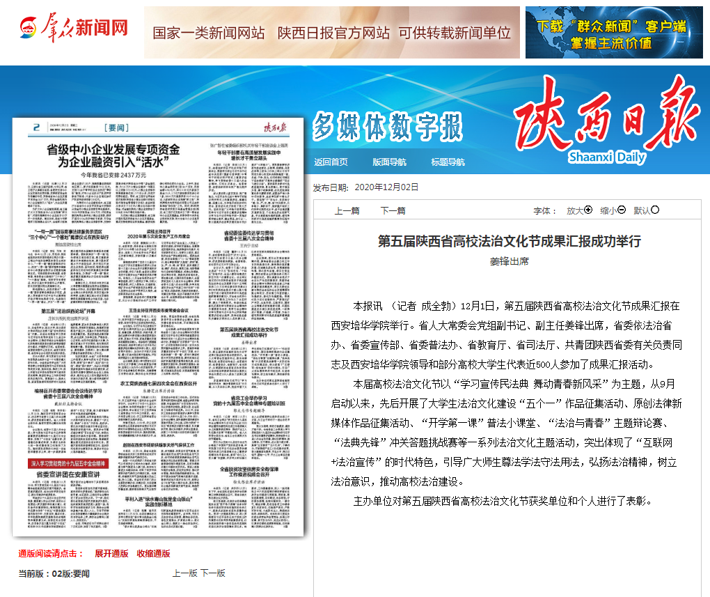 12月1日,第五届陕西省高校法治文化节成果汇报在西安培华学院举行。省人大常委会党组副书记、副主任姜锋出席,省委依法治省办、省委宣传部、省委普法办、省教育厅、省司法厅、共青团陕西省委有关负责同志及西安培华学院领导和部分高校大学生代表近500人参加了成果汇报活动。