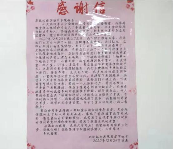 近日,一位在红会医院就诊的患者给西安培华学院发来感谢信,特别感谢西安培华学院建筑与艺术设计学院工程造价1902(专)班的雷杨舟同学,信中详细介绍了其在红会医院帮助陌生患者的好人好事事迹,让人深受感动。