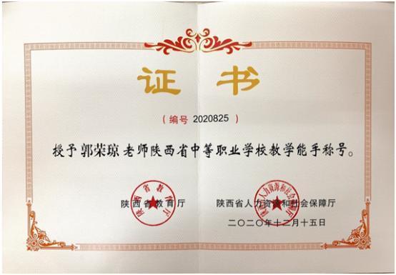 岁月静美,喜讯频传,2020年陕西省教学能手评选工作已落下帷幕,根据陕西省教育厅、陕西省人社厅陕教[2020]194号文件公示,经学校申报推荐、学科评审组集中评议、评选工作领导小组会议评议审定,西安培华学院郭荣琼老师以优异的表现荣获“陕西省教学能手”称号。
