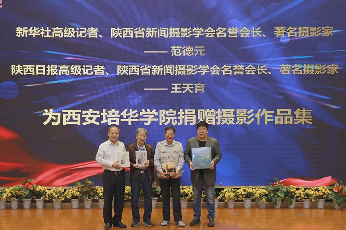此外,在新闻发布会的进行过程中还举行了捐赠书籍的仪式,新华社高级记者、陕西省新闻摄影学会名誉会长、著名摄影家范德元先生 ,陕西日报高级记者、陕西省新闻摄影学会名誉会长、著名摄影家王天育以及西安电影制片厂研究员、陕西省文史馆研究员、著名摄影家柏雨果先生为西安培华学院捐赠摄影作品集。
