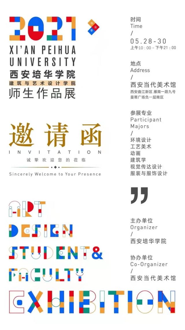 5月28日至30日,西安培华学院建筑与艺术设计学院师生作品展在西安当代美术馆举行,本次参展专业有环境设计、工艺美术、动画、建筑学、视觉传达设计、服装与服饰设计。