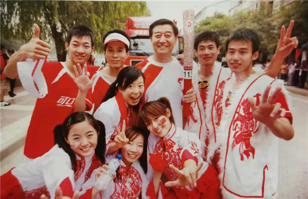 作为2008年奥运会国内第113棒火炬手徐国富(后排右二)与健美操队员合影受访者供图