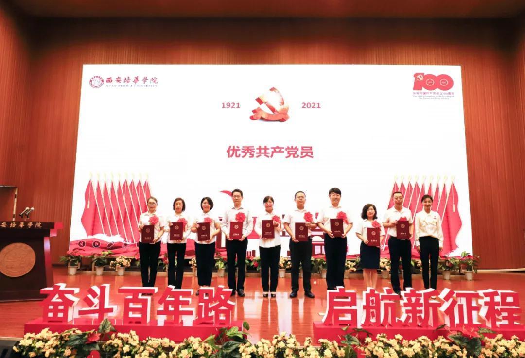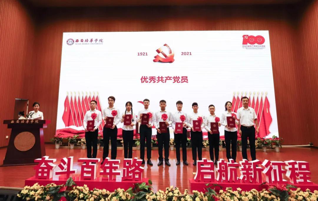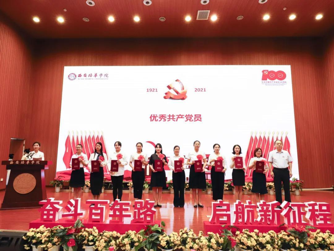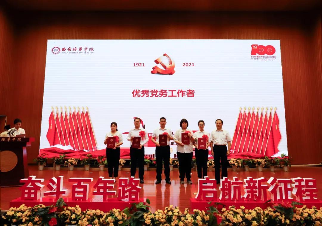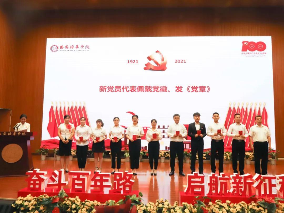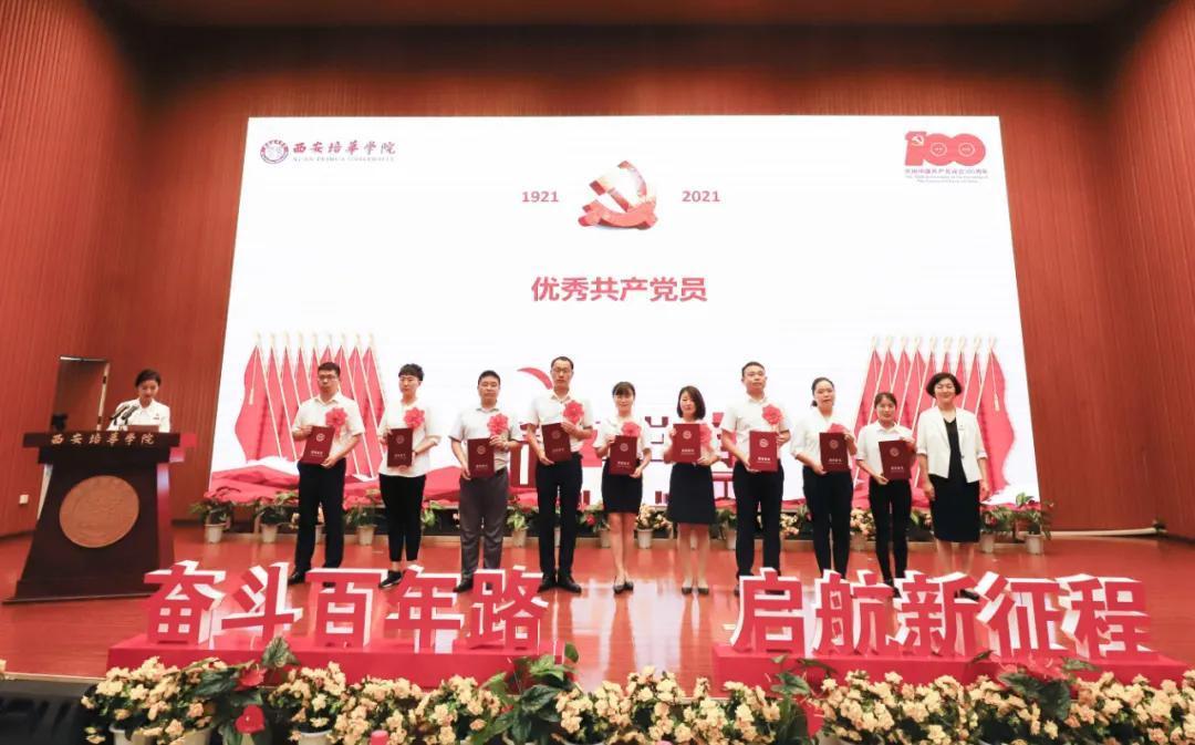 奋斗百年路,启航新征程。为热烈庆祝中国共产党成立100周年,2021年7月9日上午,西安培华学院学习贯彻习近平总书记“七一”重要讲话精神暨表彰大会隆重召开。陕西省政协常委、致公党陕西省委会副主委、西安培华学院理事长姜波出席活动并讲话,学校党政领导班子成员,各基层党组织负责人,校工会委员会委员,各基层分会主席,各单位党务兼行政干事,受表彰的先进单位、优秀个人代表,参加宣誓的新党员代表以及师生党员代表参加了活动。