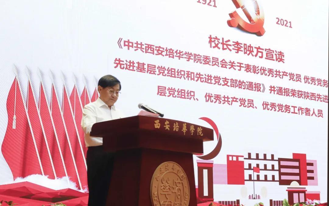 图/校长李映方宣读《中共西安培华学院委员会关于表彰优秀共产党员 优秀党务工作者 先进基层党组织和先进党支部的通报》并通报荣获陕西高校先进基层党组织、优秀共产党员、优秀党务工作者人员