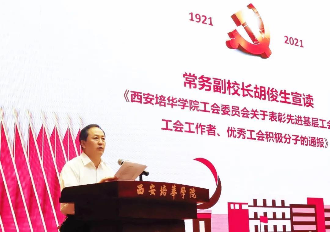 图/常务副校长胡俊生宣读《西安培华学院关于表彰先进基层工会 优秀工会工作者 优秀工会积极分子的通报》