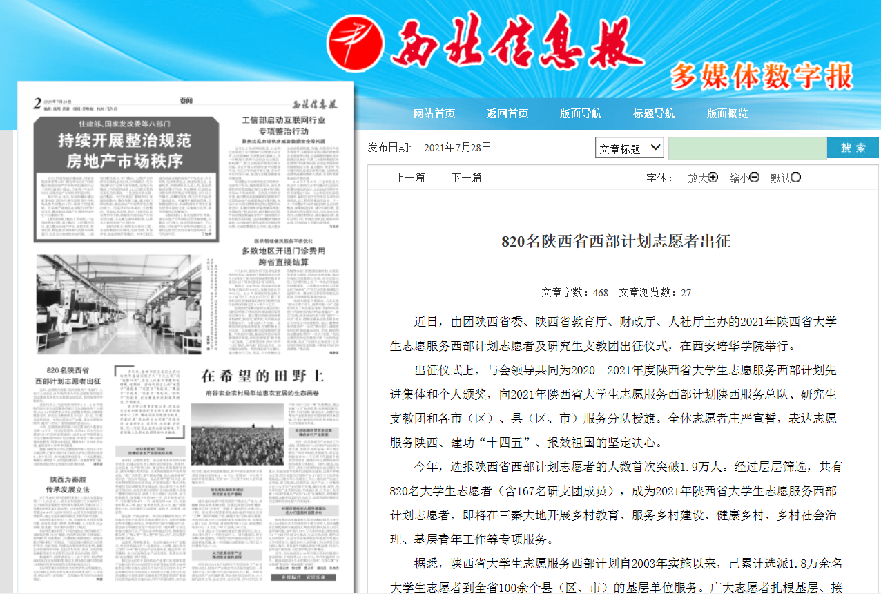 近日,由团陕西省委、陕西省教育厅、财政厅、人社厅主办的2021年陕西省大学生志愿服务西部计划志愿者及研究生支教团出征仪式,在西安培华学院举行。