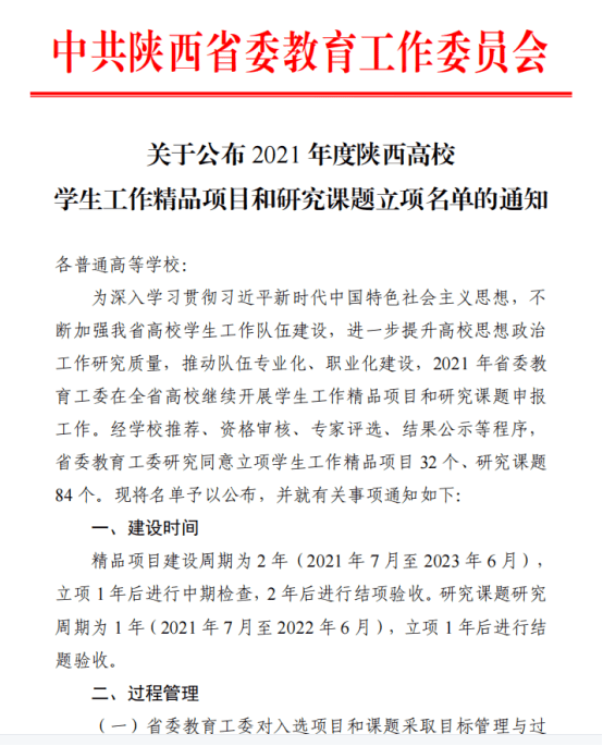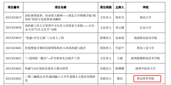 根据《关于公布2021年度陕西高校学生工作精品项目和研究课题立项名单的通知》的文件,西安培华学院党委学生工作部蔡亮主持的《三聚三融联动:红色基因融入大学生爱国主义教育实践研究》获得“学生工作精品项目”立项,传媒学院高嘉炜主持的《新时代陕西民办高校辅导员培训体系构建研究》获得“学生工作研究课题”立项。