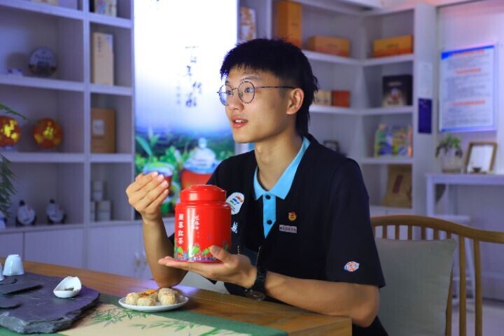 图为2021年7月8日,团队成员通过直播带货,宣传推广革命老区特色产品紫阳富硒茶。乡村振兴的发展需要新技术、新力量才能展现新风气、新面貌。 中国青年通讯员 官照卿 摄