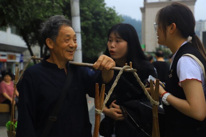 图为2021年7月2日,团队成员采访街边挑担商人,老爷爷一人挑一担绕着山路走一圈,随买随卖,热情地为我们介绍紫阳乡村的风土文化,这是紫阳别有风味的生意人,见证着老区的进步与发展。中国青年通讯员 官照卿 摄
