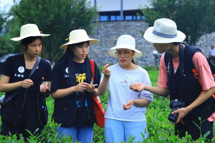 图为2021年7月7日,团队成员来到茶园之中,同茶农学习种植技术,用镜头记录着茶农们的辛勤,并与茶农们分享当今时代的新媒体宣传手段。中国青年通讯员 官照卿 摄