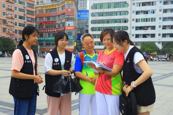 2021年7月3日,团队成员采访广场锻炼身体的幸福夫妻,他们对乡村振兴有不同的看法,认为幸福与满足感是最为重要的,并表示现在的生活安逸康雅,对所有下乡的大学生表示热烈的欢迎。 中国青年通讯员 官照卿 摄
