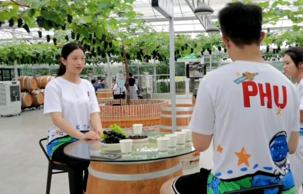 图为实践队工作人员在进行直播带货,主要介绍葡萄的相关情况。中国青年网通讯员 焦思源 摄