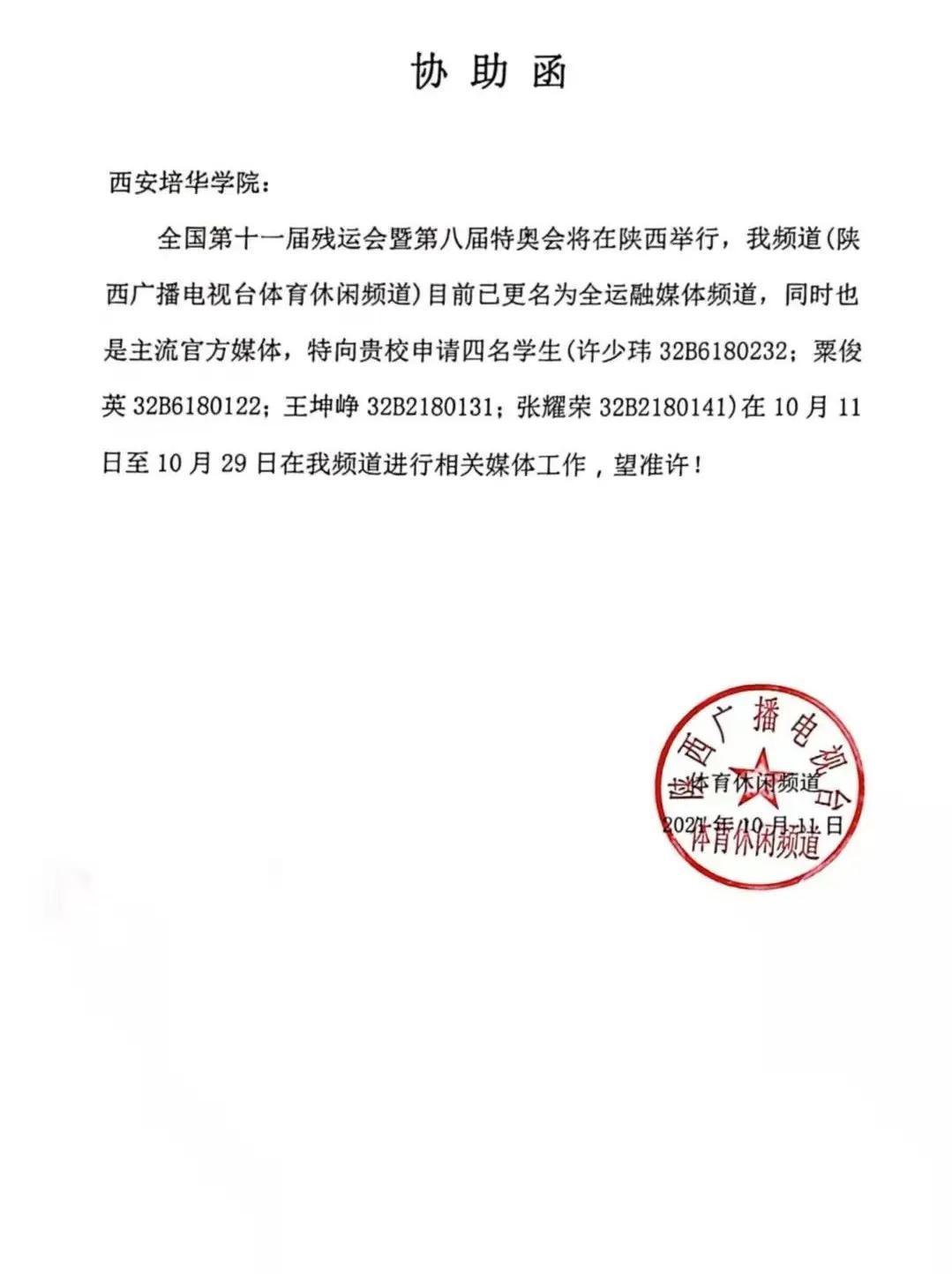 2021年4月份,西安培华学院受邀参与残特奥会开幕式演出工作,学校1200余名师生积极报名参与,经过层层选拔,学校最终有6名仪式引导员、280名赛会志愿者、286名学生演员和18名管理老师承担各代表队进场引导、现场观众组织志愿服务、第三篇章中《手舞矩阵》和尾声部分的演出任务。