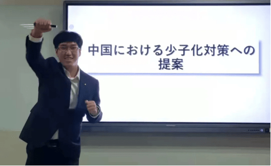 西安培华学院杨昕海同学演示形式新颖、内容简洁明了,围绕中国的结婚习俗习惯,对我国少子化提出解决建议。最终获得乙组冠军及赴日交流的机会。
