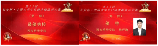 在10月30日举办的第22届“长安杯·中国大学生日语才能演示大赛”中,学校人文与国际教育学院外语系日语专业学生杨昕海凭借出色表现,荣获大赛乙组一等奖,西安培华学院荣获“最优秀学校奖”,西安培华学院日语专业教师小泽一博获得“优秀指导教师”。