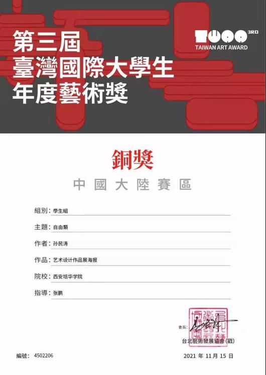 近日,由中国台北市政府教育局发起及主办,台北艺术发展协会承办,台湾艺术大学、淡江大学等高校支持的2021第三届台湾国际大学生年度艺术赛顺利结束。此次赛事中,大陆赛区共计作品数量32186件。其中,西安培华学院建筑与艺术设计学院视觉传达设计专业2019级学生孙民涛,在张鹏老师的指导下,凭借扎实的专业基础能力及创意表现手法,获第三届台湾国际大学生年度艺术奖大陆赛区铜奖。
