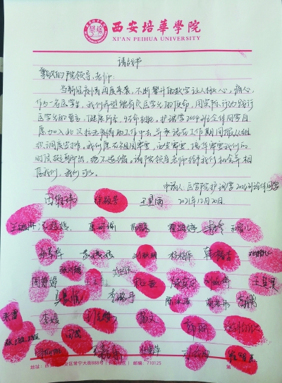 12月20日,西安培华学院护理学2004班全体学生,在“请战书”上签字、按红指印请缨奔赴一线,助力医护人员全面抗击疫情。