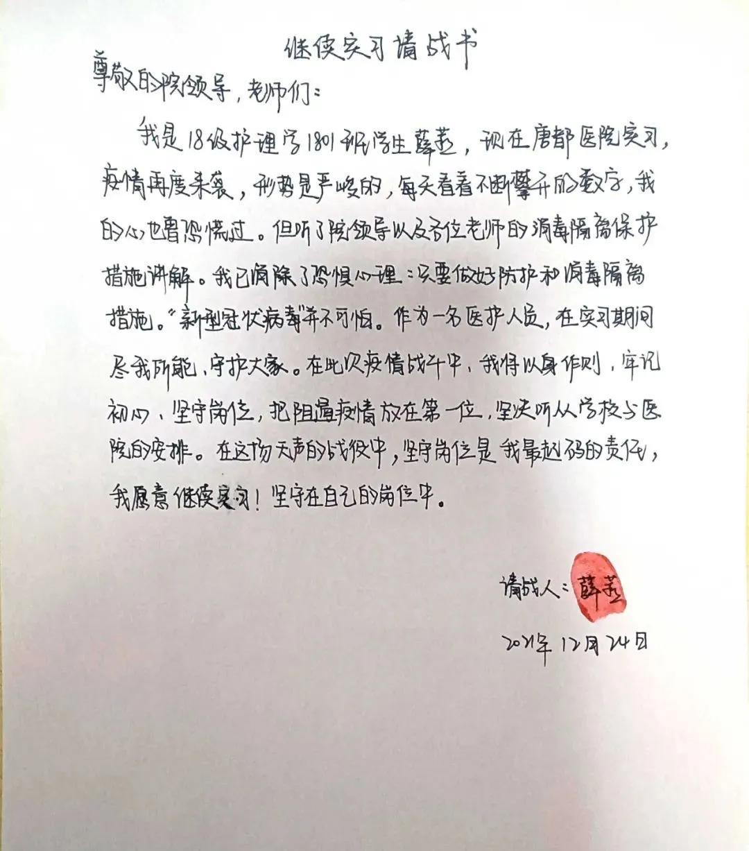 “当前疫情形势严峻,作为医护工作者的我们,有义务扛起责任,以实际行动为打赢疫情防控反击战贡献力量。虽然大部分医院都暂停实习,但我们不会退缩,我们自愿继续实习,与广大医护人员一道,抗击疫情,贡献自己微薄之力,不求回报!”
