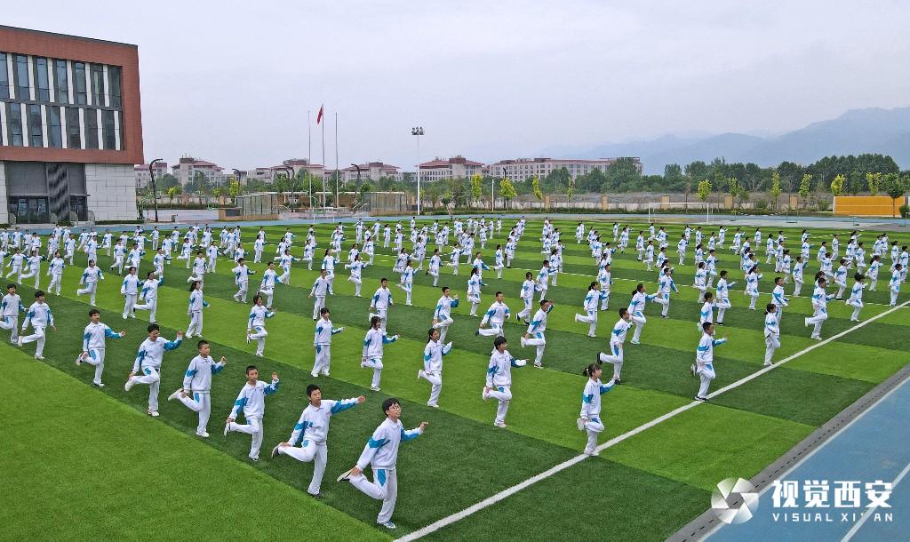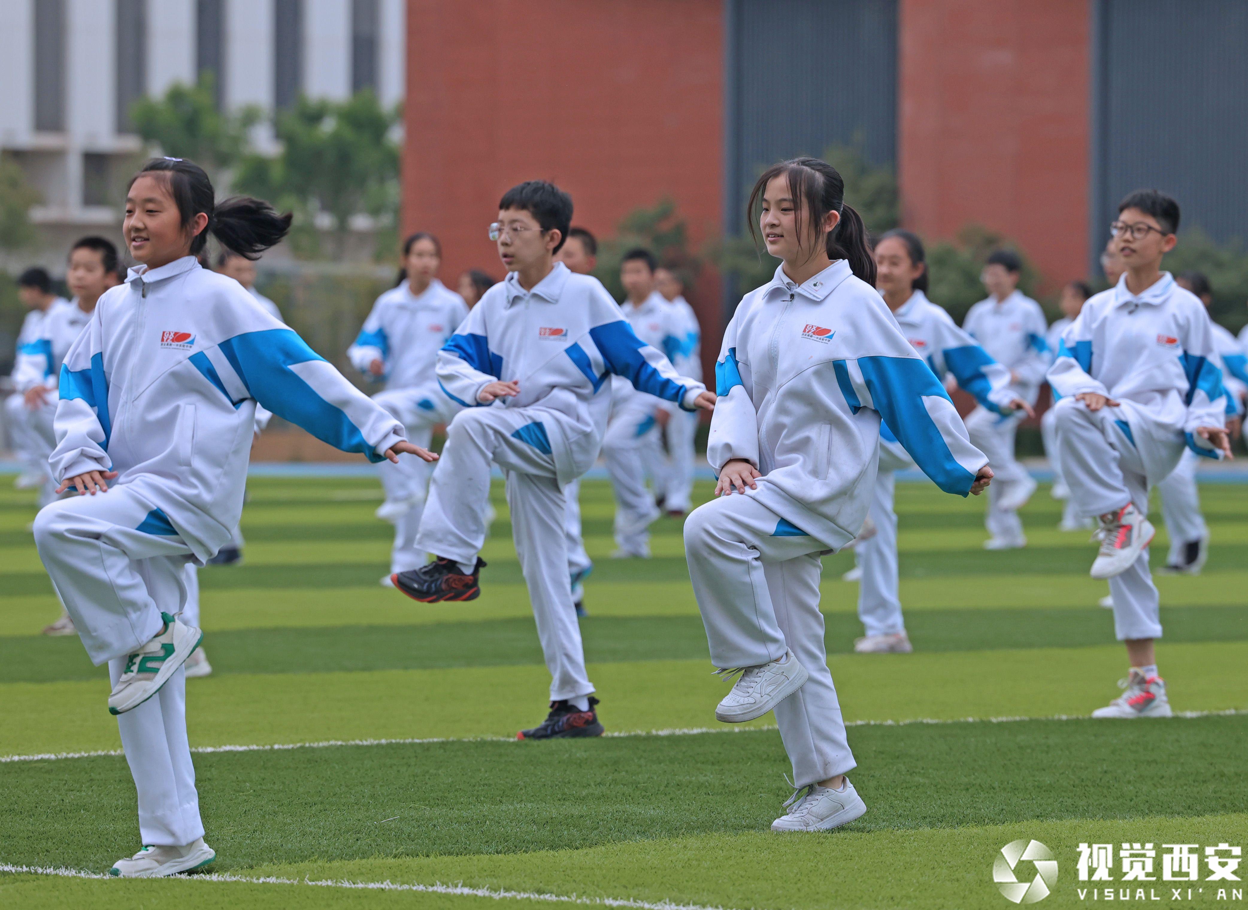 位于秦岭北麓、高新区未来中央创新区的西安高新一中实验中学,拥有优美的环境、清新的空气和绿色环保的现代化体育场馆设施,5月13日下午,当200余名初中学生共同跳起毽子操时,场面颇为壮观。该校七年级(初一)三班的吉烜宁和五班的宋舒维是住校生,每周只能在周末回家,不过,这对小姐妹均表示,通过课余时间和同学们一起跳毽子舞、打羽毛球,能让自己充分放松,“自习和运动结束后,我们每晚十点准时熄灯睡觉,第二天六点半起床,生活很规律、精力也特别充沛。”七年级二班的刘语涵是为数不多的走读生之一,虽比其他同学增加了一些奔波之苦,可她却笑着表示,如今学校在减轻学生课堂作业和课外培训负担方面做得很不错,“我们有不少时间可以参与自己喜欢的运动。除了组织大家学跳毽子操之外,学校还开设了游泳课、红拳课,也组建了健美操等体育社团,同学们都很喜欢。”
