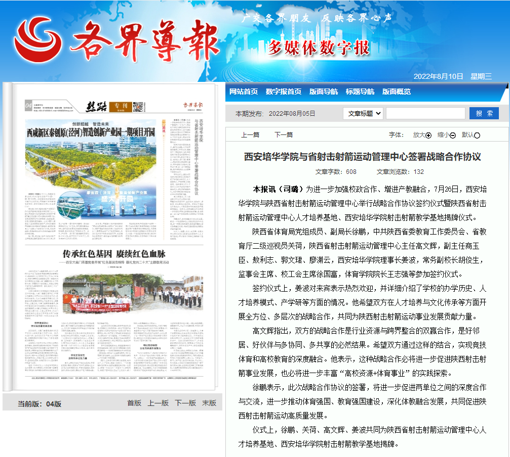 报讯(司璐)为进一步加强校政合作、增进产教融合,7月26日,西安培华学院与陕西省射击射箭运动管理中心举行战略合作协议签约仪式暨陕西省射击射箭运动管理中心人才培养基地、西安培华学院射击射箭教学基地揭牌仪式。