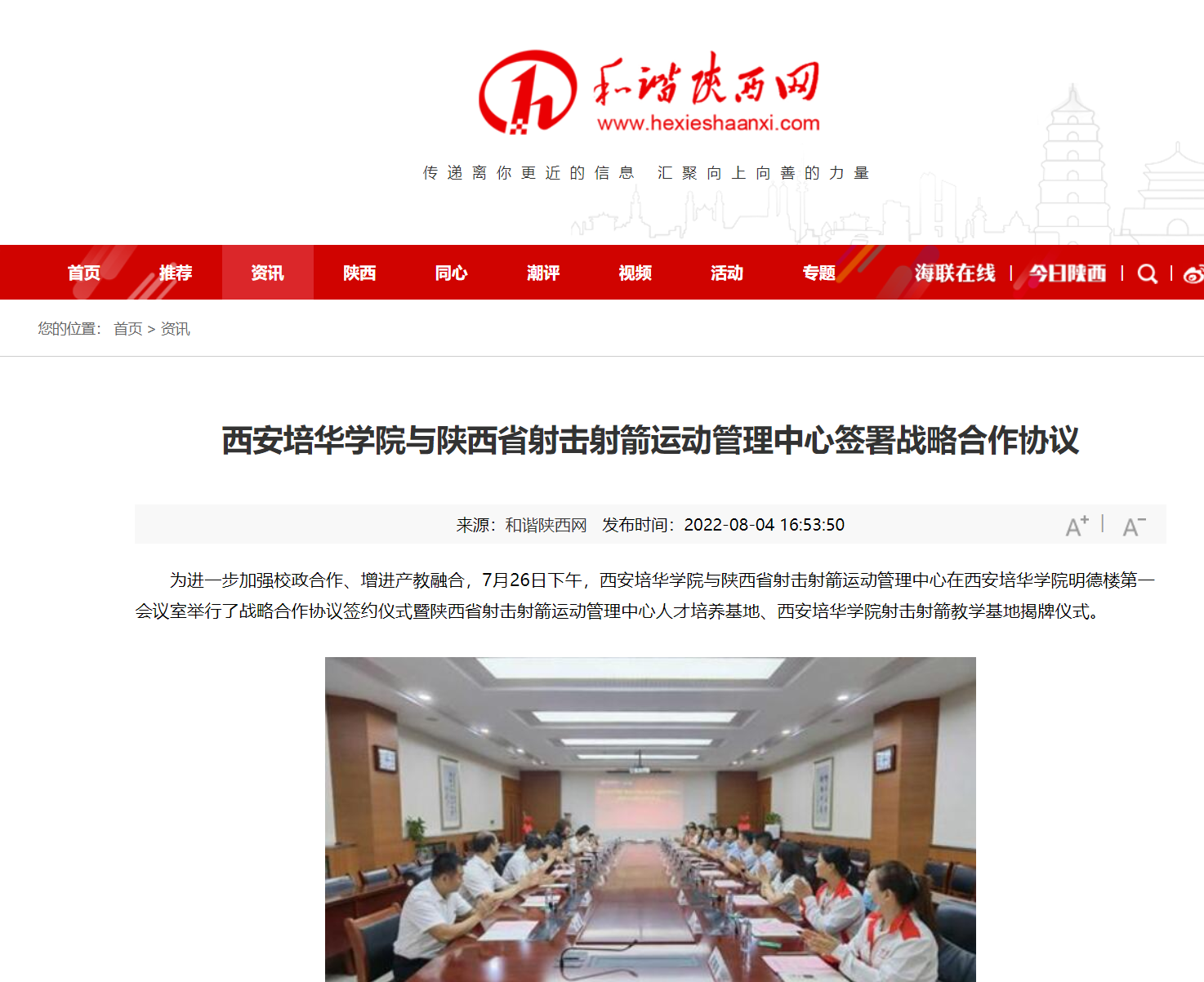 为进一步加强校政合作、增进产教融合,7月26日下午,西安培华学院与陕西省射击射箭运动管理中心举行战略合作协议签约仪式暨陕西省射击射箭运动管理中心人才培养基地、西安培华学院射击射箭教学基地揭牌仪式。