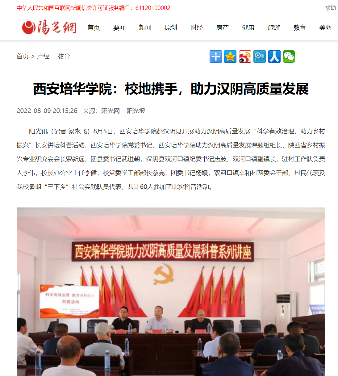 8月5日,西安培华学院赴汉阴县开展助力汉阴高质量发展“科学有效治理 助力乡村振兴”长安讲坛科普活动,西安培华学院党委书记、西安培华学院助力汉阴高质量发展课题组组长、陕西省乡村振兴专业研究会会长罗新远,团县委书记武进朝,汉阴县双河口镇纪委书记唐波,双河口镇副镇长,驻村工作队负责人李伟,校长办公室主任李健,校党委学工部部长蔡亮,团委书记杨媛,双河口镇幸和村两委会干部、村民代表及我校暑期“三下乡”社会实践队员代表,共计60人参加了此次科普活动。