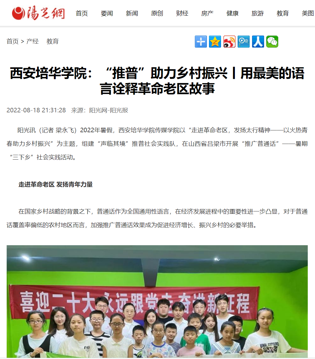 2022年暑假,西安培华学院传媒学院以“走进革命老区,发扬太行精神——以火热青春助力乡村振兴”为主题,组建“声临其境”推普社会实践队,在山西省吕梁市开展“推广普通话”——暑期 “三下乡”社会实践活动。