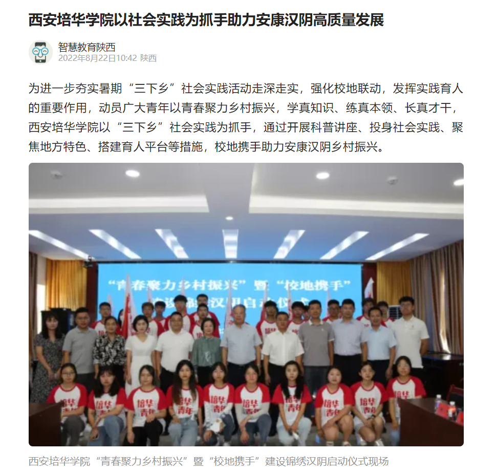 --搭建育人平台,强化校地有效联动。在社会实践开展的过程中,实践队员与服务地建立了良好的合作关系,与当地的15个村镇建立了大学生社会实践和劳动教育基地;通过社会实践开展服务的队伍,在结束实践后收到当地实践证明、感谢信共计20余封,有效的扩大了社会实践的影响力和覆盖面;在进一步推进“校地联动”工作的过程中,西安培华学院和汉阴县联合举行了“喜迎二十大 永远跟党走 奋进新征程——‘青春聚力乡村振兴’暨‘校地携手’建设锦绣汉阴社会实践启动仪式”,这一举措有效促进了育人平台的作用发挥,进一步巩固了实践成果。