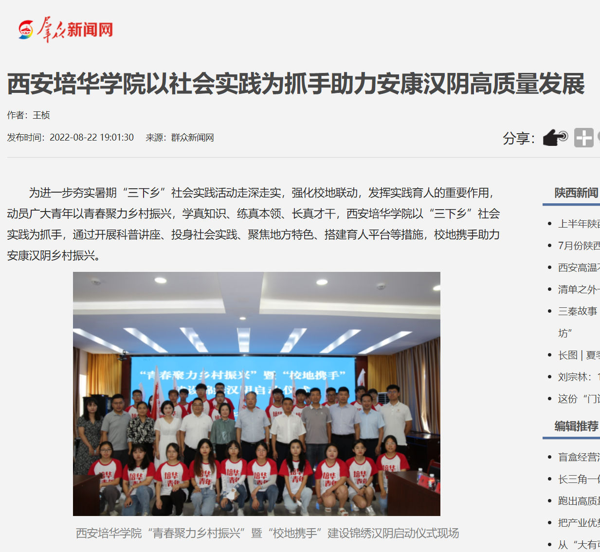 群众新闻网:西安培华学院以社会实践为抓手助力安康汉阴高质量发展