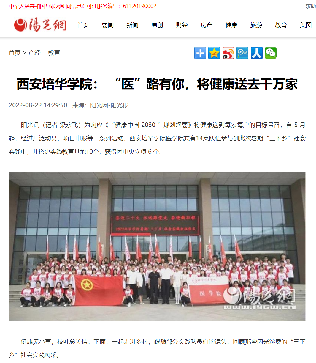 为响应《“健康中国 2030 ”规划纲要》将健康送到每家每户的目标号召,自 5 月起,经过广泛动员、项目申报等一系列活动,西安培华学院医学院共有14支队伍参与到此次暑期“三下乡”社会实践中,并搭建实践教育基地10个,获得团中央立项 6 个。