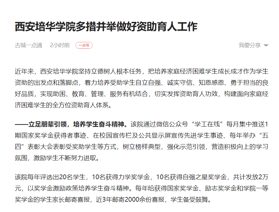 一点资讯:西安培华学院多措并举做好资助育人工作