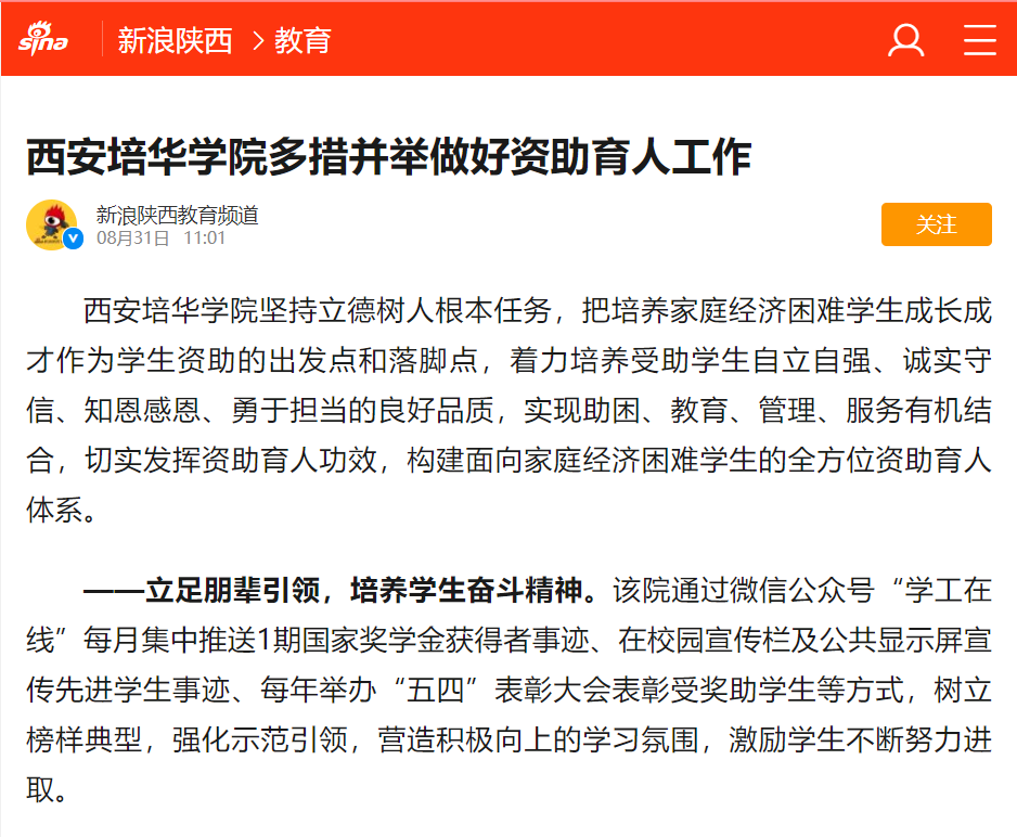 西安培华学院坚持立德树人根本任务,把培养家庭经济困难学生成长成才作为学生资助的出发点和落脚点,着力培养受助学生自立自强、诚实守信、知恩感恩、勇于担当的良好品质,实现助困、教育、管理、服务有机结合,切实发挥资助育人功效,构建面向家庭经济困难学生的全方位资助育人体系。
