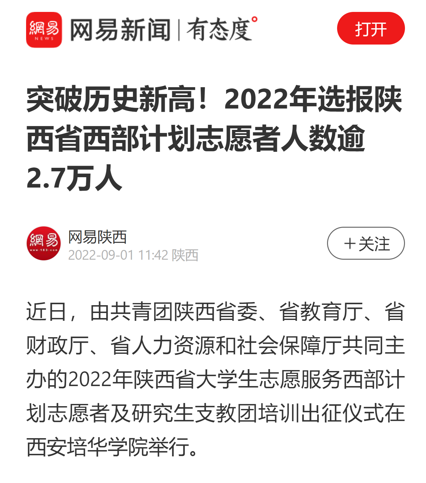 网易新闻:突破历史新高!2022年选报陕西省西部计划志愿者人数逾2.7万人