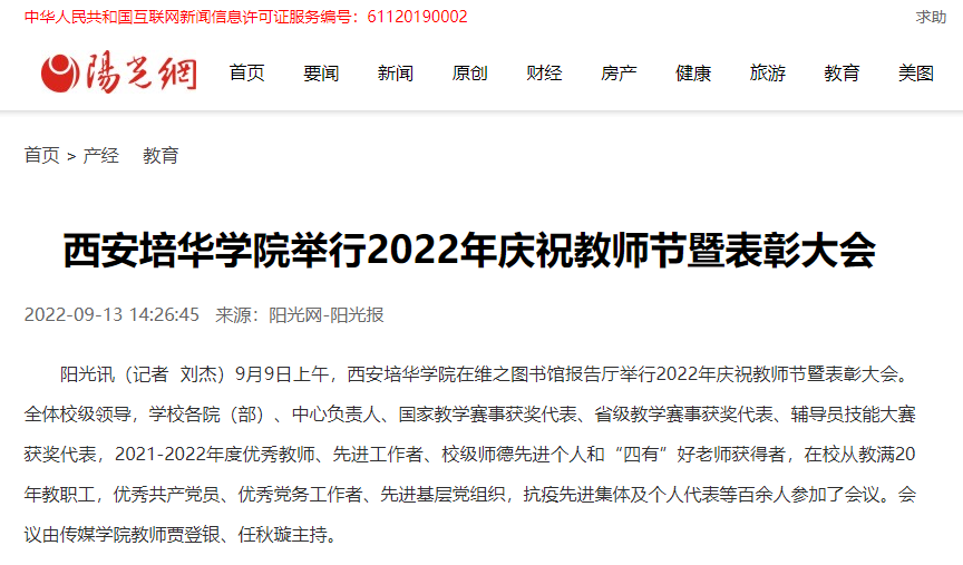 阳光讯(记者 刘杰)9月9日上午,西安培华学院在维之图书馆报告厅举行2022年庆祝教师节暨表彰大会。全体校级领导,学校各院(部)、中心负责人、国家教学赛事获奖代表、省级教学赛事获奖代表、辅导员技能大赛获奖代表,2021-2022年度优秀教师、先进工作者、校级师德先进个人和“四有”好老师获得者,在校从教满20年教职工,优秀共产党员、优秀党务工作者、先进基层党组织,抗疫先进集体及个人代表等百余人参加了会议。会议由传媒学院教师贾登银、任秋璇主持。