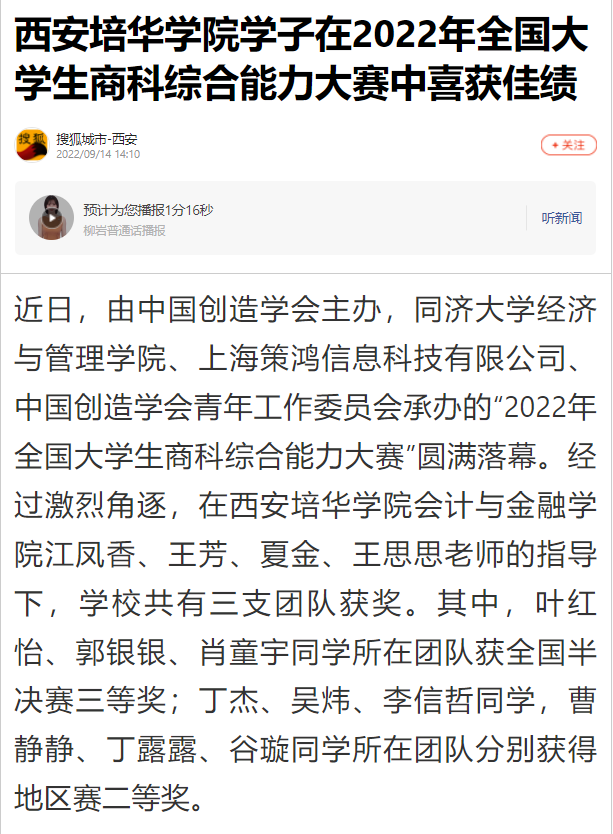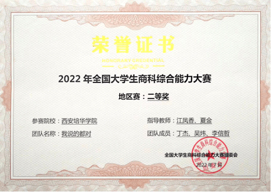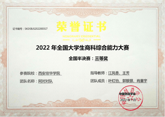 近日,由中国创造学会主办,同济大学经济与管理学院、上海策鸿信息科技有限公司、中国创造学会青年工作委员会承办的“2022年全国大学生商科综合能力大赛”圆满落幕。经过激烈角逐,在西安培华学院会计与金融学院江凤香、王芳、夏金、王思思老师的指导下,学校共有三支团队获奖。其中,叶红怡、郭银银、肖童宇同学所在团队获全国半决赛三等奖;丁杰、吴炜、李信哲同学,曹静静、丁露露、谷璇同学所在团队分别获得地区赛二等奖。