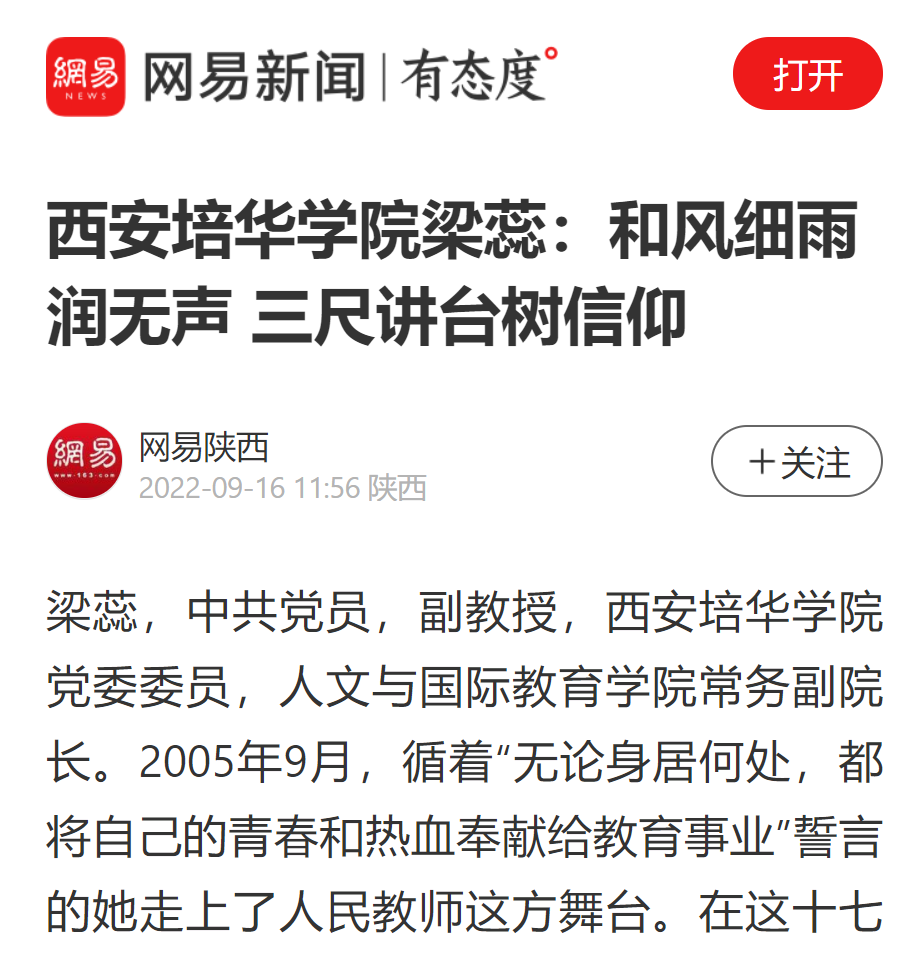 网易新闻:西安培华学院梁蕊:和风细雨润无声 三尺讲台树信仰