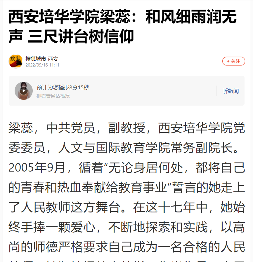 搜狐新闻:西安培华学院梁蕊:和风细雨润无声 三尺讲台树信仰