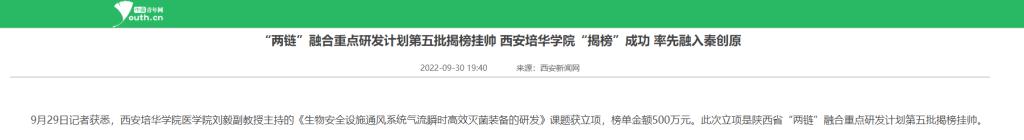 9月29日记者获悉,西安培华学院医学院刘毅副教授主持的《生物安全设施通风系统气流瞬时高效灭菌装备的研发》课题获立项,榜单金额500万元。此次立项是陕西省“两链”融合重点研发计划第五批揭榜挂帅。