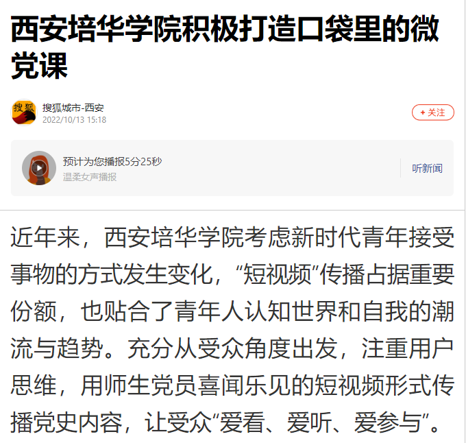 搜狐新闻:西安培华学院积极打造口袋里的微党课