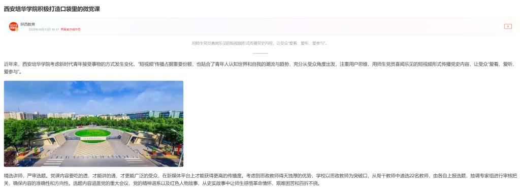 近年来,西安培华学院考虑新时代青年接受事物的方式发生变化,“短视频”传播占据重要份额,也贴合了青年人认知世界和自我的潮流与趋势,充分从受众角度出发,注重用户思维,用师生党员喜闻乐见的短视频形式传播党史内容,让受众“爱看、爱听、爱参与”。