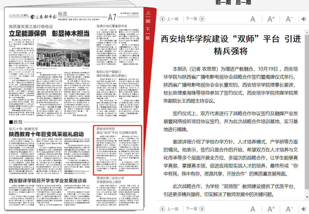 为增进产教融合,10月19日 ,西安培华学院与陕西省广播电影电视协会战略合作签约暨揭牌仪式举行。陕西省广播电影电视协会会长童宏钧,西安培华学院理事长姜波,校长助理秦海锋等领导参加了签约仪式,西安培华学院传媒学院常务副院长王西娅主持会议。